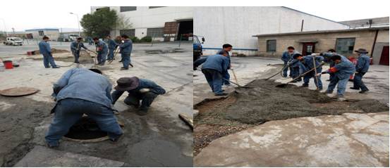 時至夏日,天氣多變。臨時土建維修隊充分發(fā)揮車間人員中懂得土建施工技能的優(yōu)勢,悉心謀劃,從職工家中借用攪拌機等施工機械,加班加點有序進行著屋面防水修復、路面地基處理、排水溝的修復等維修工作。在公司車隊密切配合下,截至6月4日共修復屋面防水358平方米,路面維修290平方米、路基整修87立方米,排水溝修復15米,生產(chǎn)廠區(qū)道路破裂,瀝青澆灌等各項工作。
